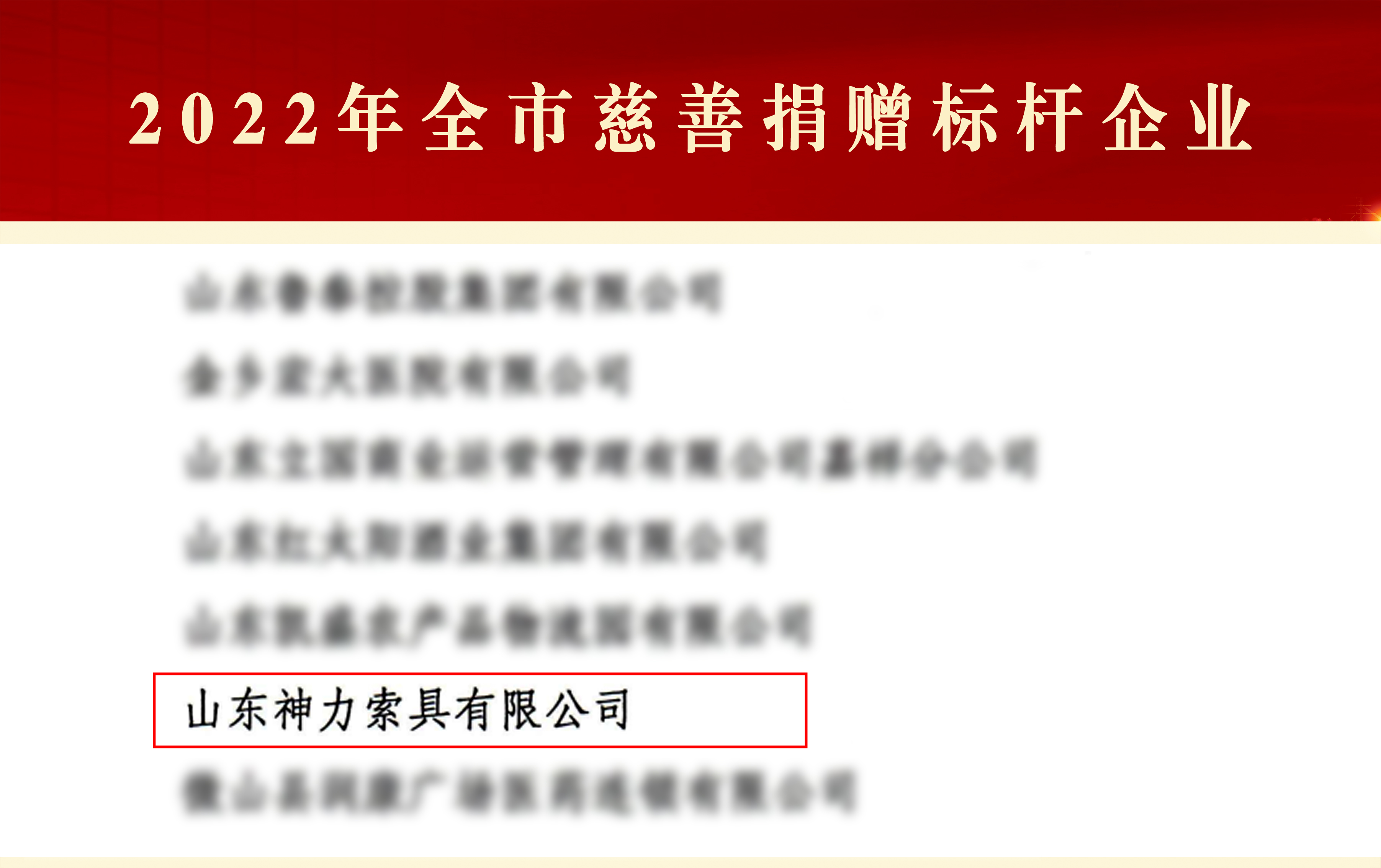 為深入貫徹市委、市政府關(guān)于打響“慈潤濟寧·善行萬家”品牌、開展慈善文化“六進”行動部署要求,表揚先進,樹立榜樣,濟寧市慈善總會發(fā)布了《關(guān)于表揚2022年度全市慈善工作先進集體先進個人的通報》,神力索具榮獲“2022年全市慈善捐贈標(biāo)桿企業(yè)”稱號。