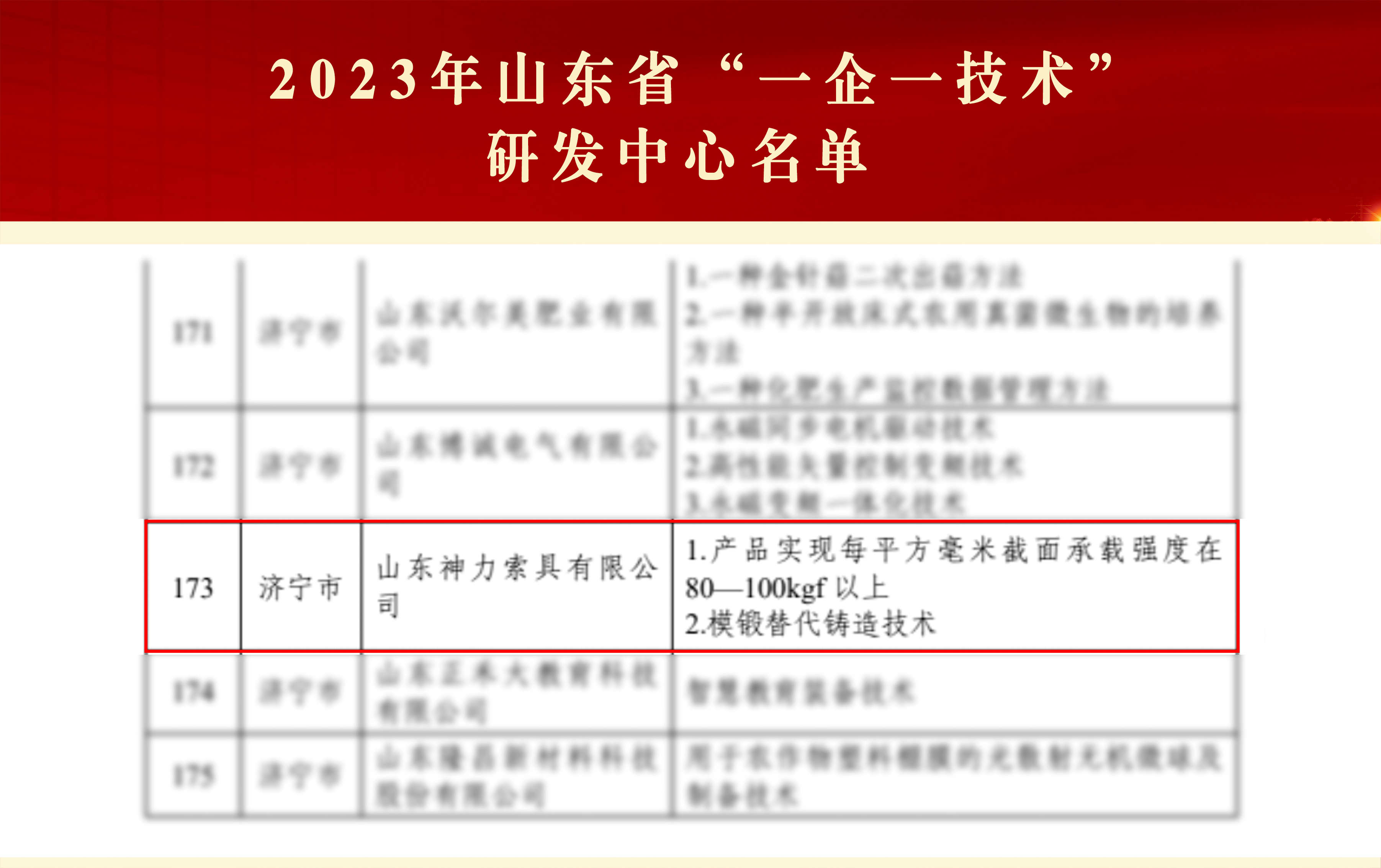 經(jīng)企業(yè)自愿申報、有關(guān)部門推薦、專家論證和網(wǎng)上公示等程序,認(rèn)定全省288家企業(yè)研發(fā)機(jī)構(gòu)為2023年山東省“一企一技術(shù)”研發(fā)中心,其中神力索具憑借關(guān)鍵技術(shù)“1、產(chǎn)品實現(xiàn)每平方毫米截面承載強(qiáng)度在80-100Kgf以上 2、模鍛替代鑄造技術(shù)”榮登榜單!
